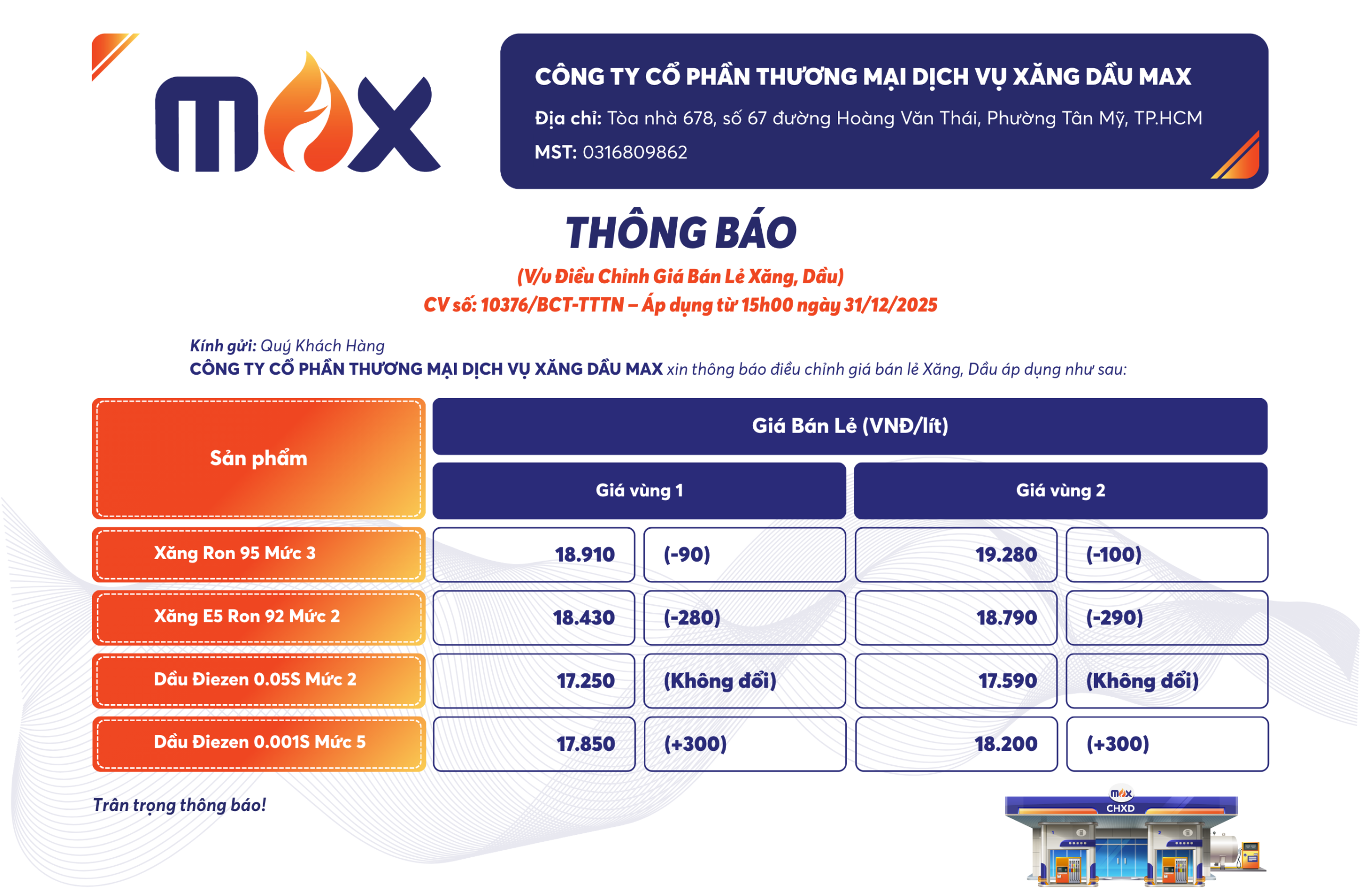 MAX PETRO THÔNG BÁO ĐIỀU CHỈNH GIÁ BÁN LẺ XĂNG DẦU