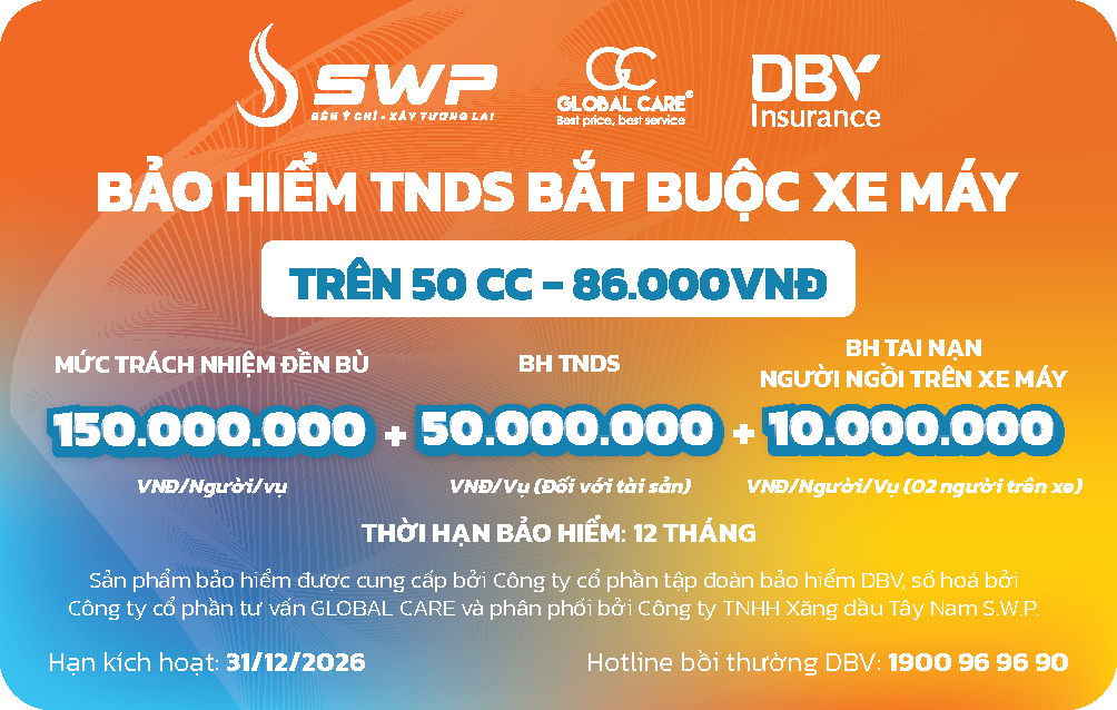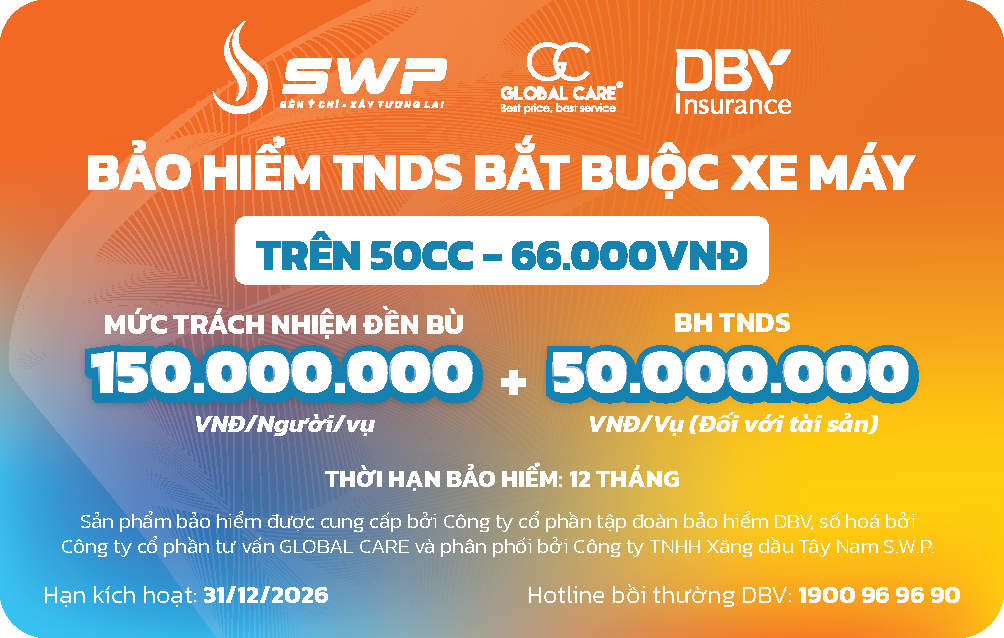 Theo quy định của Nhà nước, người sở hữu xe mô tô, xe gắn máy bắt buộc phải tham gia bảo hiểm trách nhiệm dân sự để bảo vệ quyền lợi khi xảy ra rủi ro. Thấu hiểu nhu cầu thực tế của người dân, Xăng Dầu Tây Nam SWP cùng các đơn vị thành viên Max Petro và Hoá Dầu SSO đã đề xuất triển khai giải pháp bảo hiểm xe máy điện tử, hướng đến sự thuận tiện, minh bạch và dễ tiếp cận cho khách hàng.