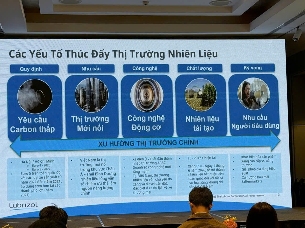 Hội thảo mang đến nhiều phân tích quan trọng về tương lai thị trường xăng dầu, đặc biệt là tác động của việc áp dụng xăng E10 từ năm 2026, yêu cầu khí thải ngày càng chặt chẽ và xu hướng tiêu dùng hướng đến nhiên liệu sạch và hiệu suất cao. Việt Nam tiếp tục được đánh giá là thị trường năng lượng nổi bật khi xăng và diesel vẫn giữ vai trò chủ đạo trong giao thông, đồng thời chuẩn bị bước vào các tiêu chuẩn mới như Euro 4 và Euro 5 ở đô thị lớn.